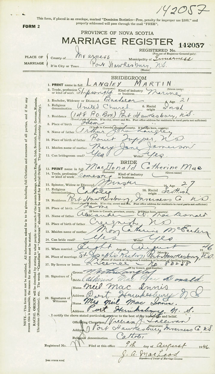 PLACE OF MARRIAGE County of Inverness in City or Town Port Hawkesbury