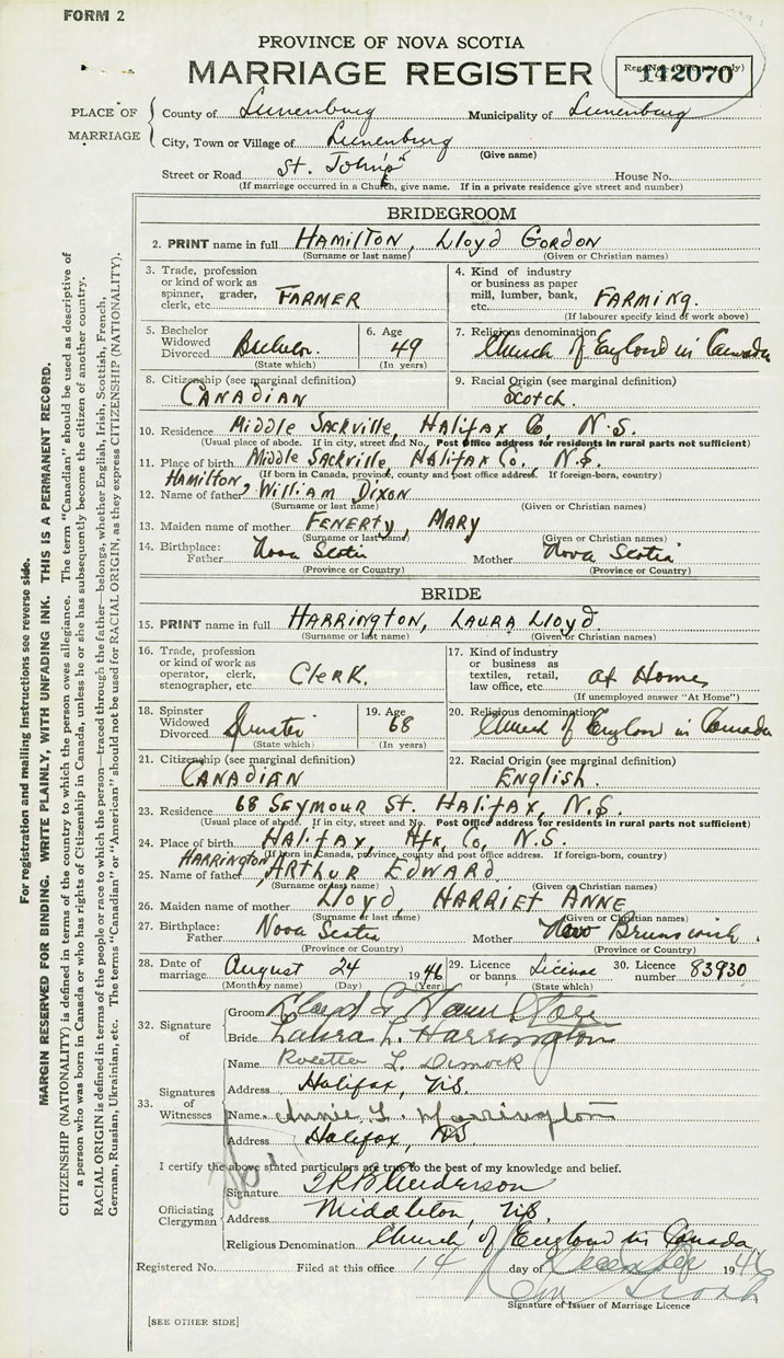 28. Date of marriage August 24 1946 29. By license or banns License 30. License number 83930