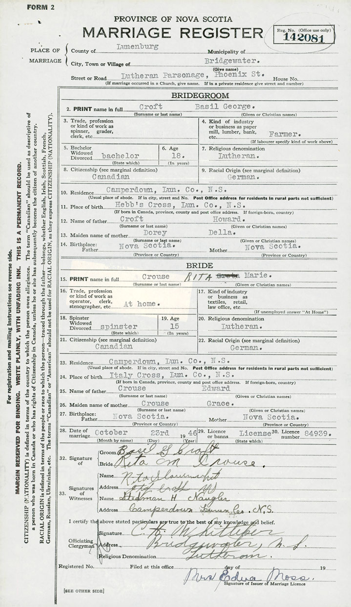 28. Date of marriage October 23 1946 29. By license or banns License 30. License number 84939