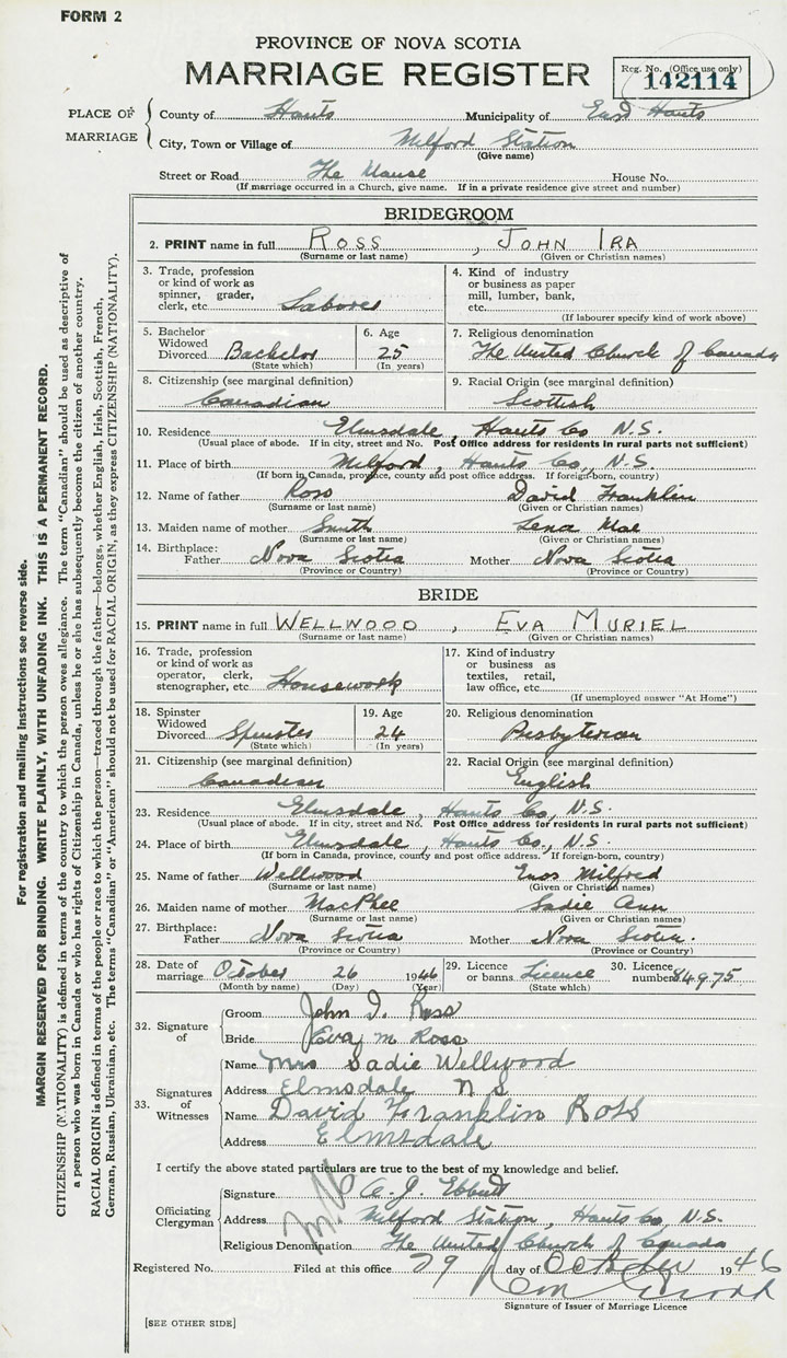 28. Date of marriage October 26 1946 29. By license or banns License 30. License number 84975