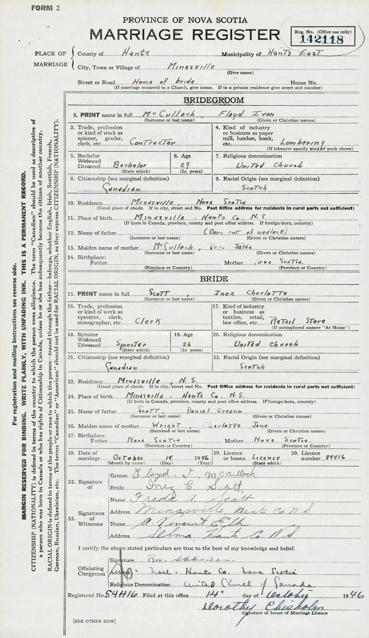 28. Date of marriage October 14 1946 29. By license or banns License 30. License number 84416