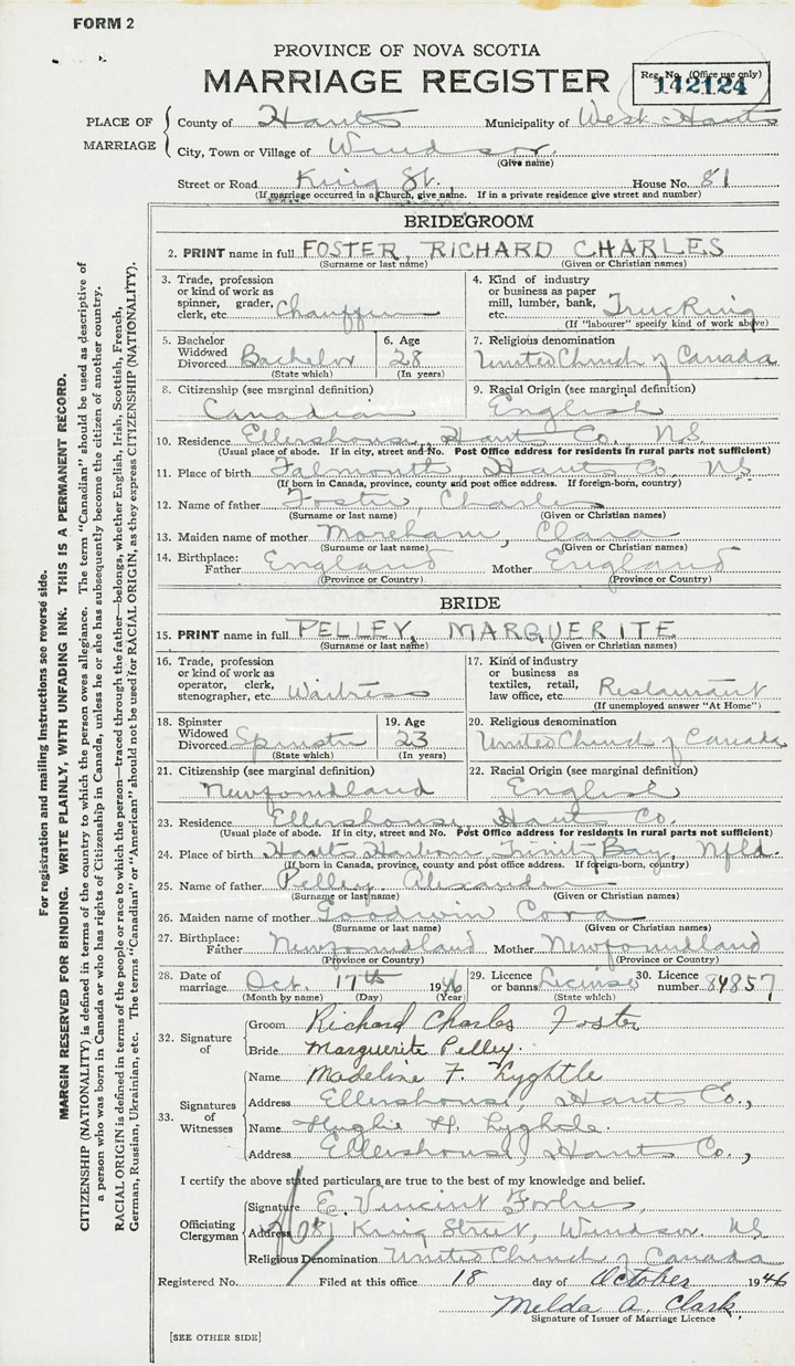 28. Date of marriage October 17 1946 29. By license or banns License 30. License number 84857