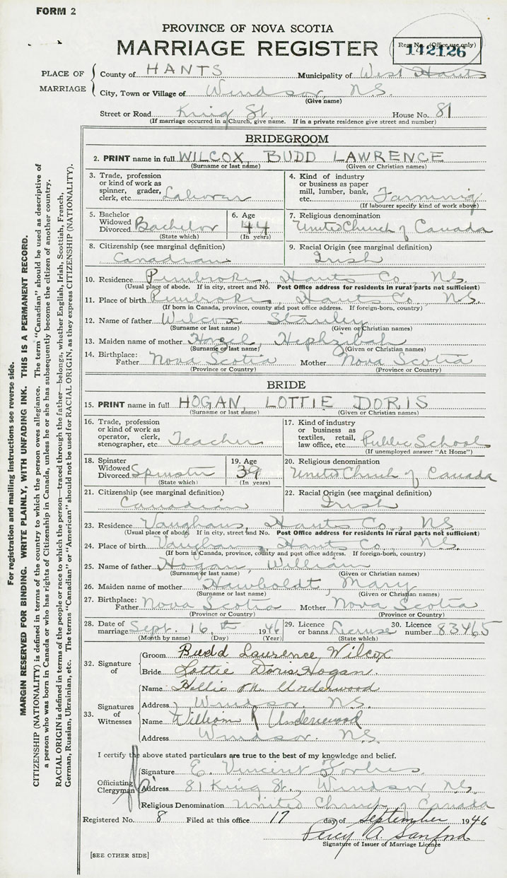 28. Date of marriage September 16 1946 29. By license or banns License 30. License number 83465