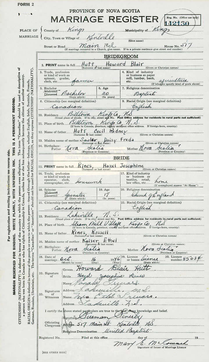 28. Date of marriage October 16 1946 29. By license or banns License 30. License number 85034
