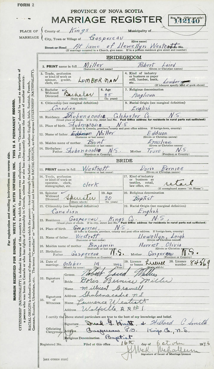 28. Date of marriage October 14 1946 29. By license or banns License 30. License number 84569