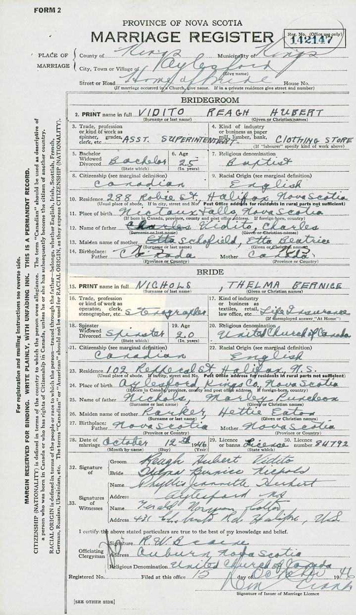 28. Date of marriage October 12 1946 29. By license or banns License 30. License number 84792