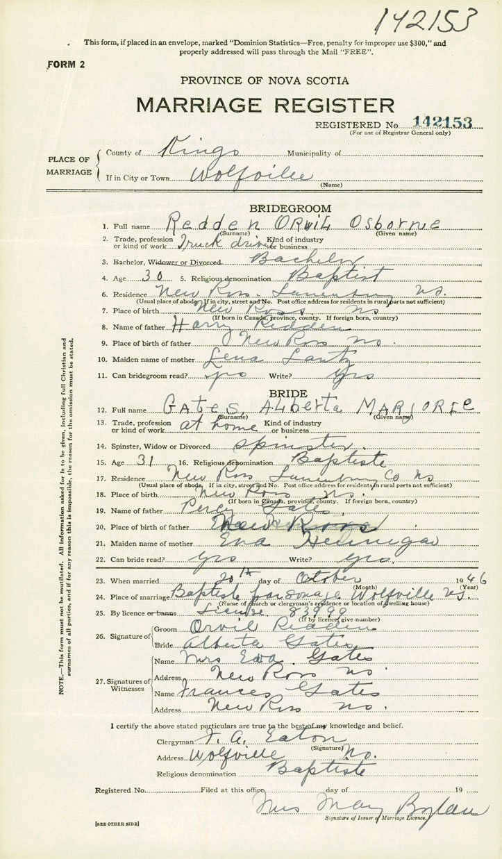 26. Place of marriage Baptist Parsonage Wolfville, Kings County
