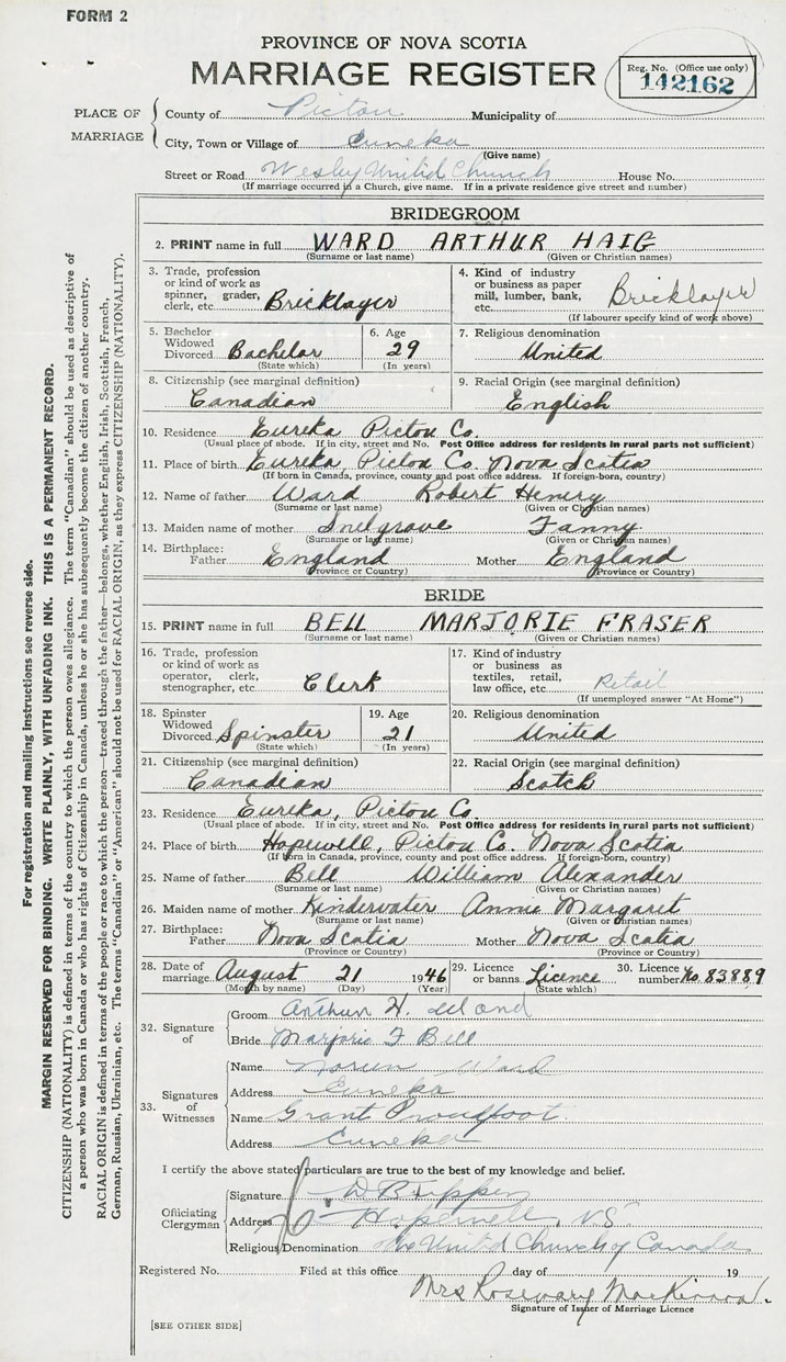 28. Date of marriage August 21 1946 29. By license or banns License 30. License number 83889