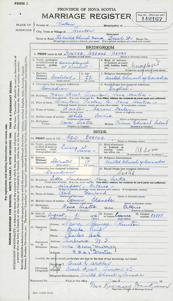 28. Date of marriage August 21 1946 29. By license or banns License 30. License number 83888