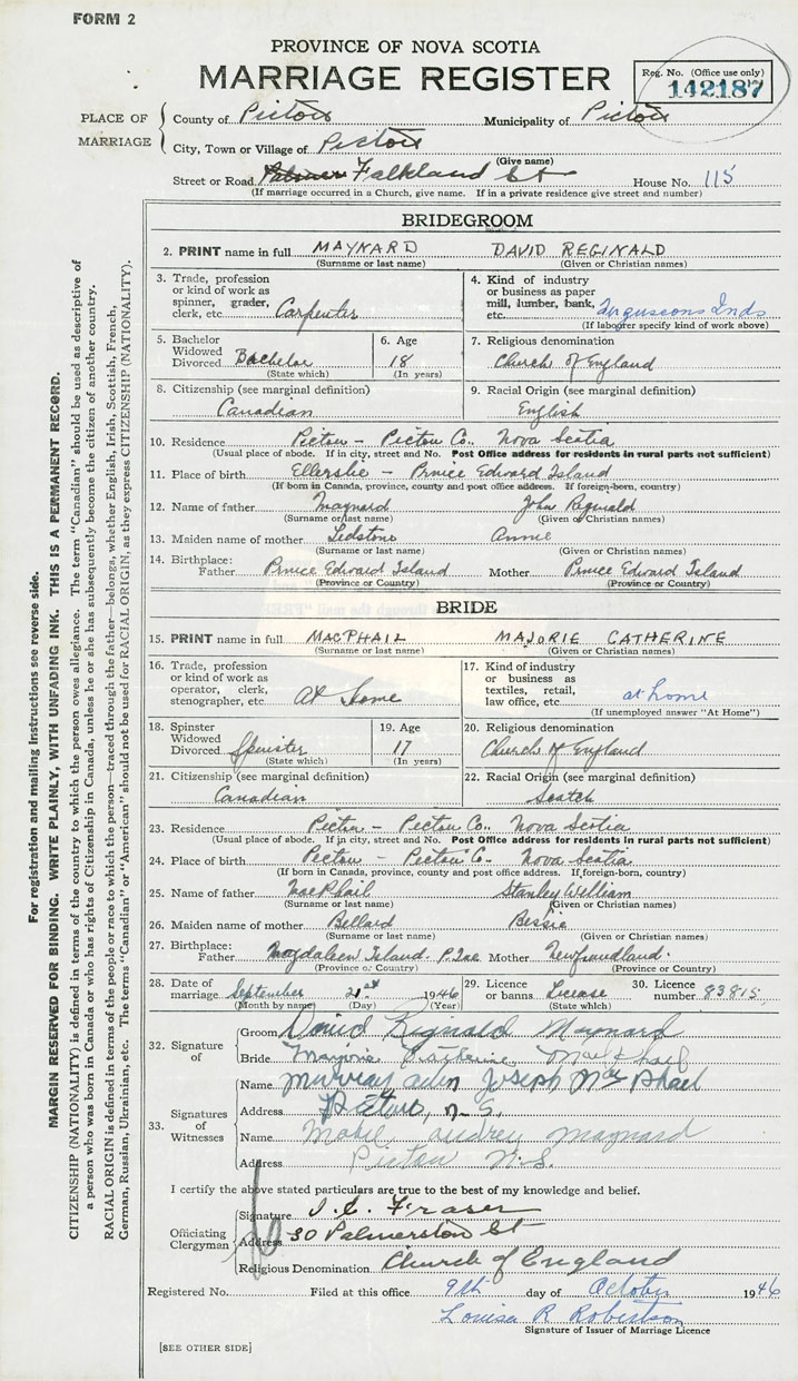 28. Date of marriage September 21 1946 29. By license or banns License 30. License number 83815