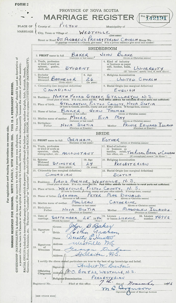 28. Date of marriage September 25 1946 29. By license or banns License 30. License number 83752