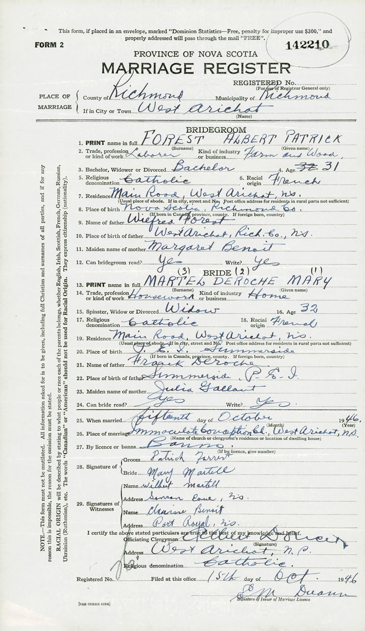 26. Place of marriage Immaculate Conception Church West Arichat, Richmond County