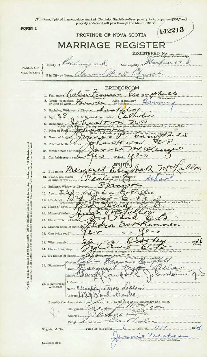 26. Place of marriage Big Pond, Cape Breton County