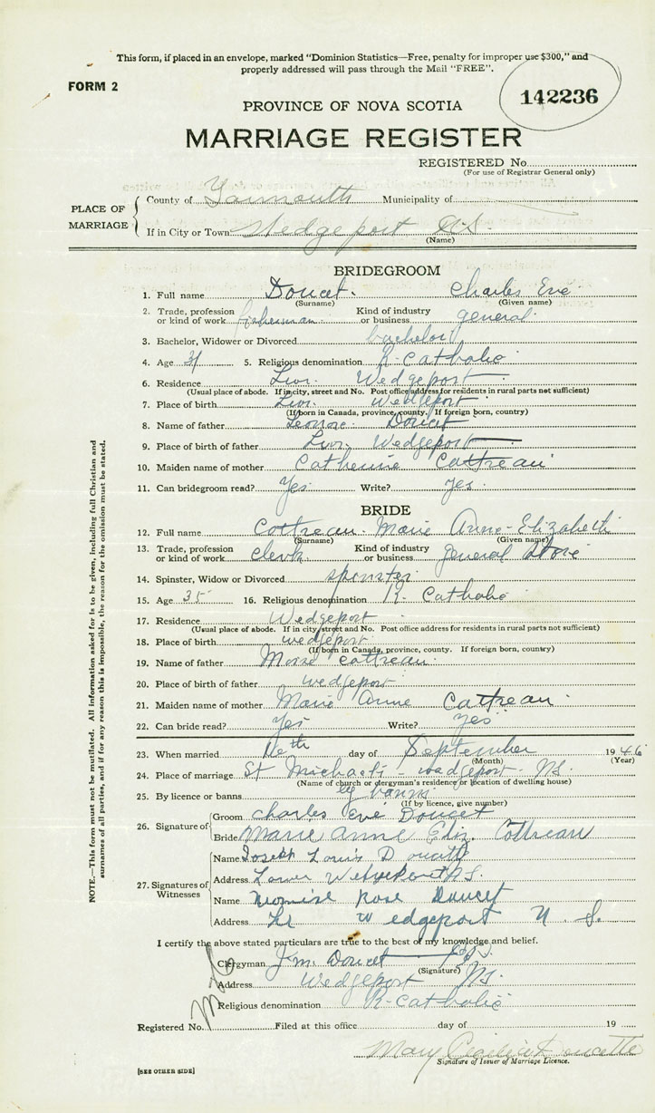 26. Place of marriage St. Michael's Wedgeport, Yarmouth County