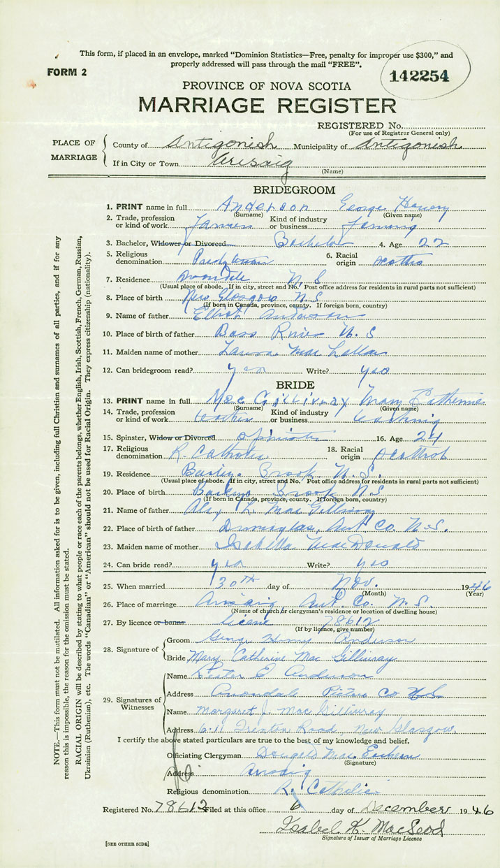 PLACE OF MARRIAGE County of Antigonish in City or Town Arisaig