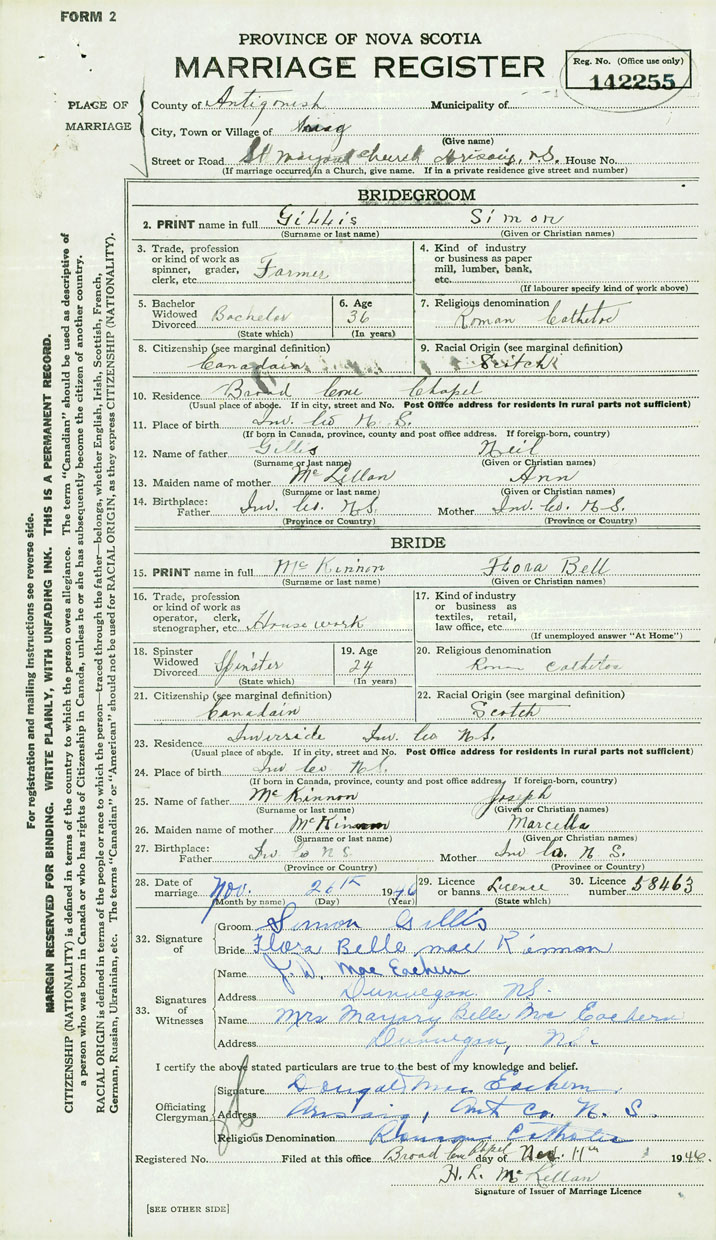PLACE OF MARRIAGE County of Antigonish