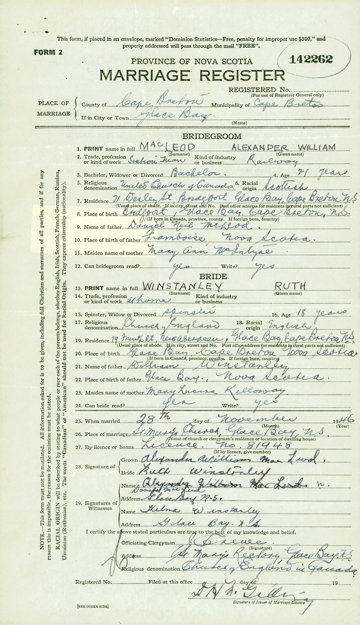 PLACE OF MARRIAGE County of Cape Breton in City or Town Glace Bay