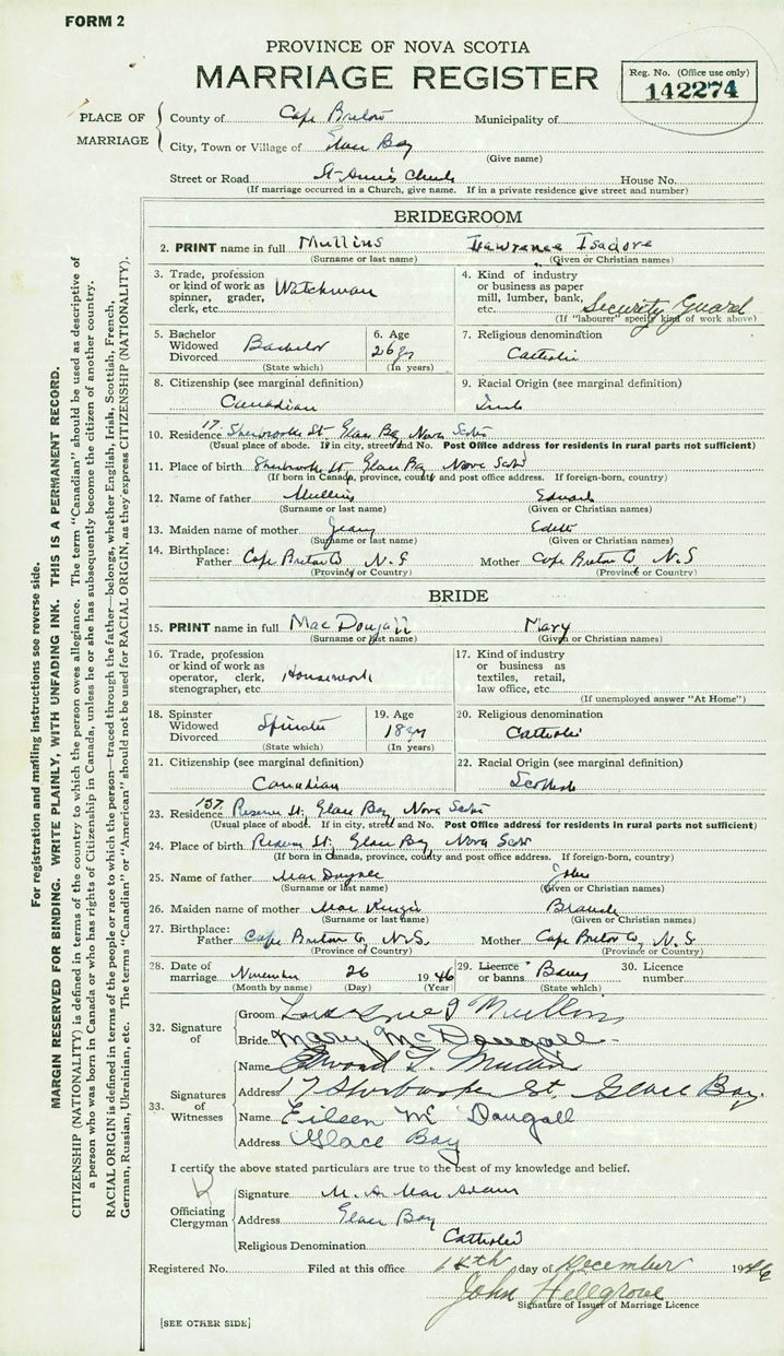 24. Place of birth Reserve St., Glace Bay