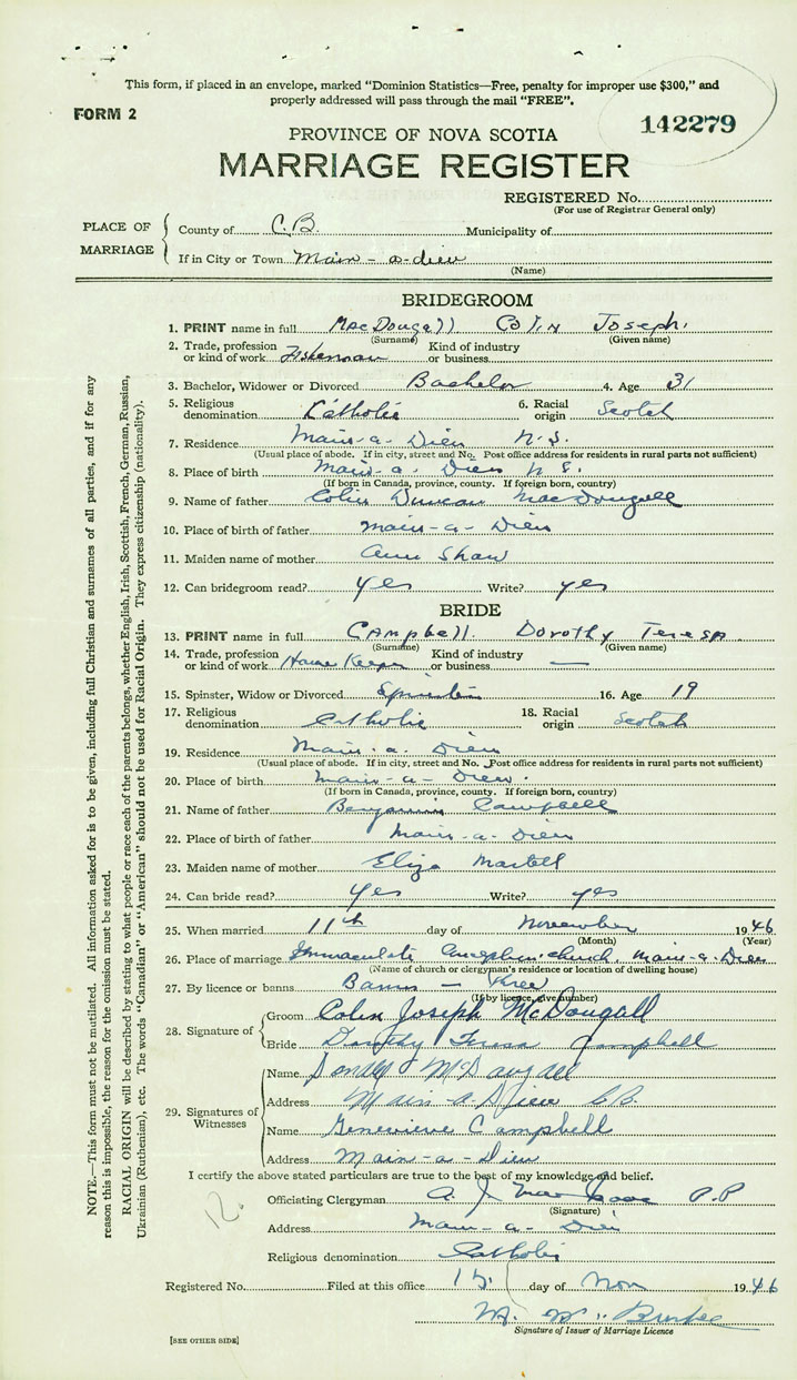 PLACE OF MARRIAGE County of Cape Breton in City or Town Main-a-Dieu