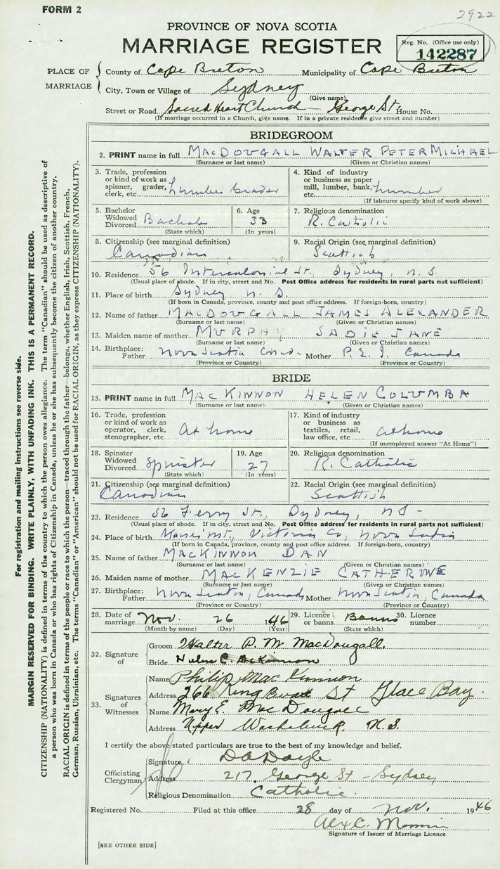 28. Date of marriage November 26 1946 29. By license or banns License 30. License number