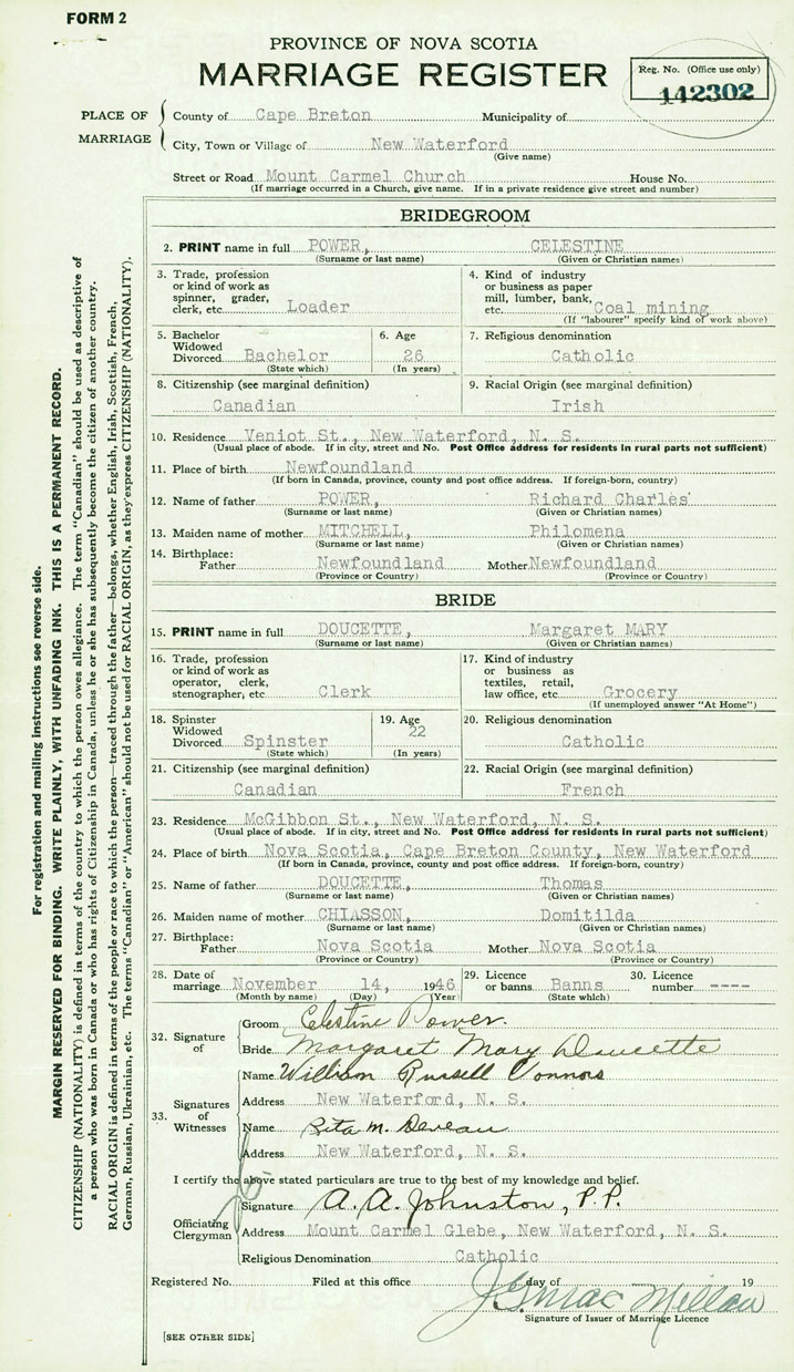 24. Place of birth New Waterford, Cape Breton County