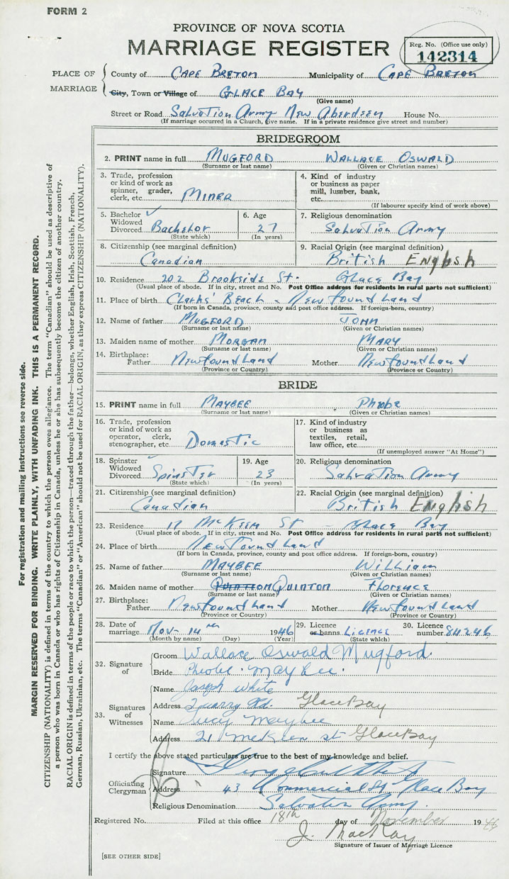 28. Date of marriage November 14 1946 29. By license or banns License 30. License number 84246