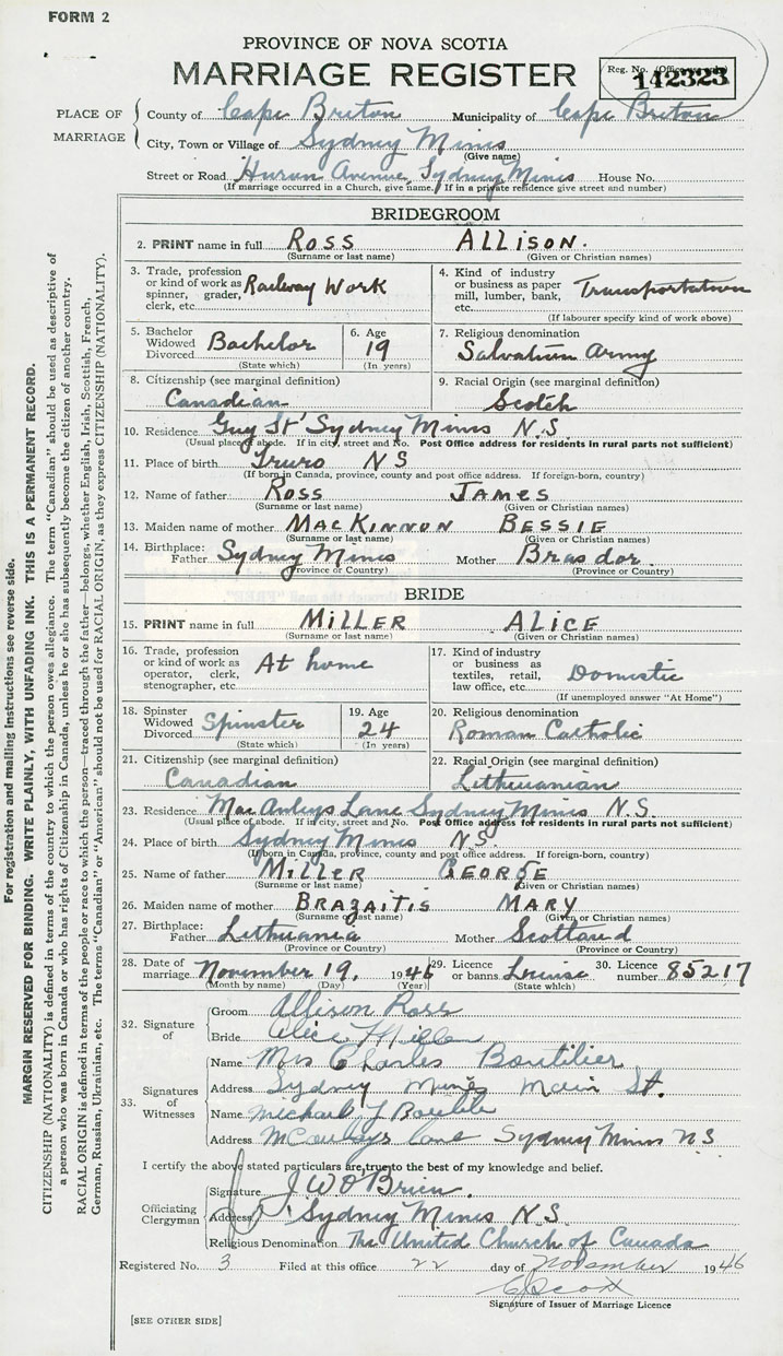 14. Birthplace Father Sydney Mines Mother Bras d'Or