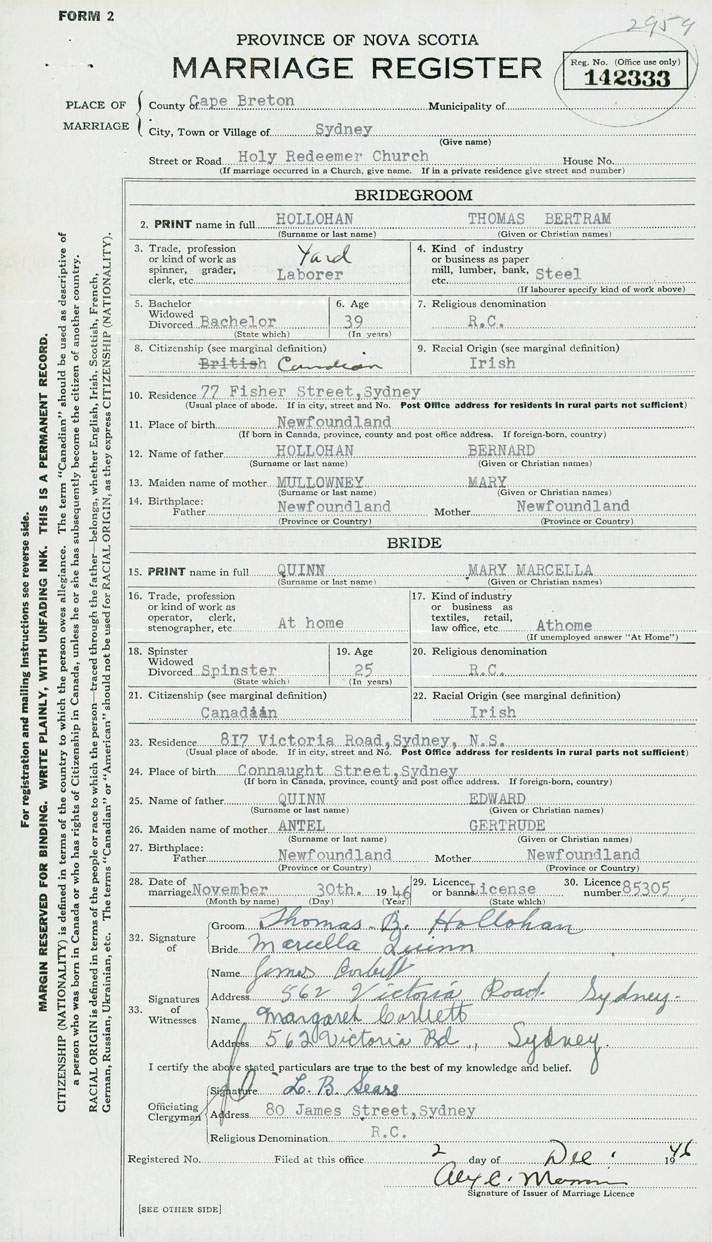 28. Date of marriage November 30 1946 29. By license or banns License 30. License number 85305