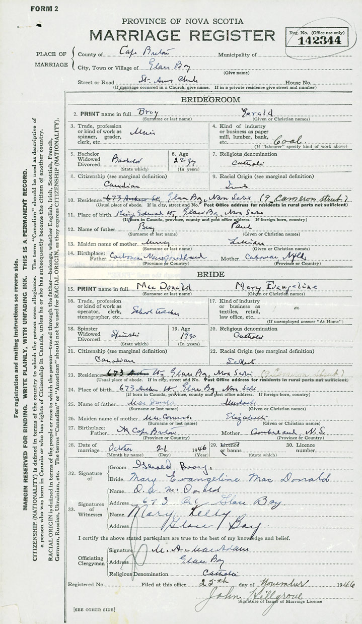 11. Place of birth King Edward St., Glace Bay Nova Scotia