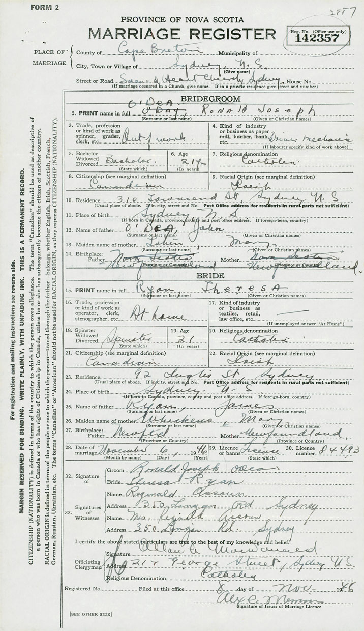 28. Date of marriage November 6 1946 29. By license or banns License 30. License number 84493