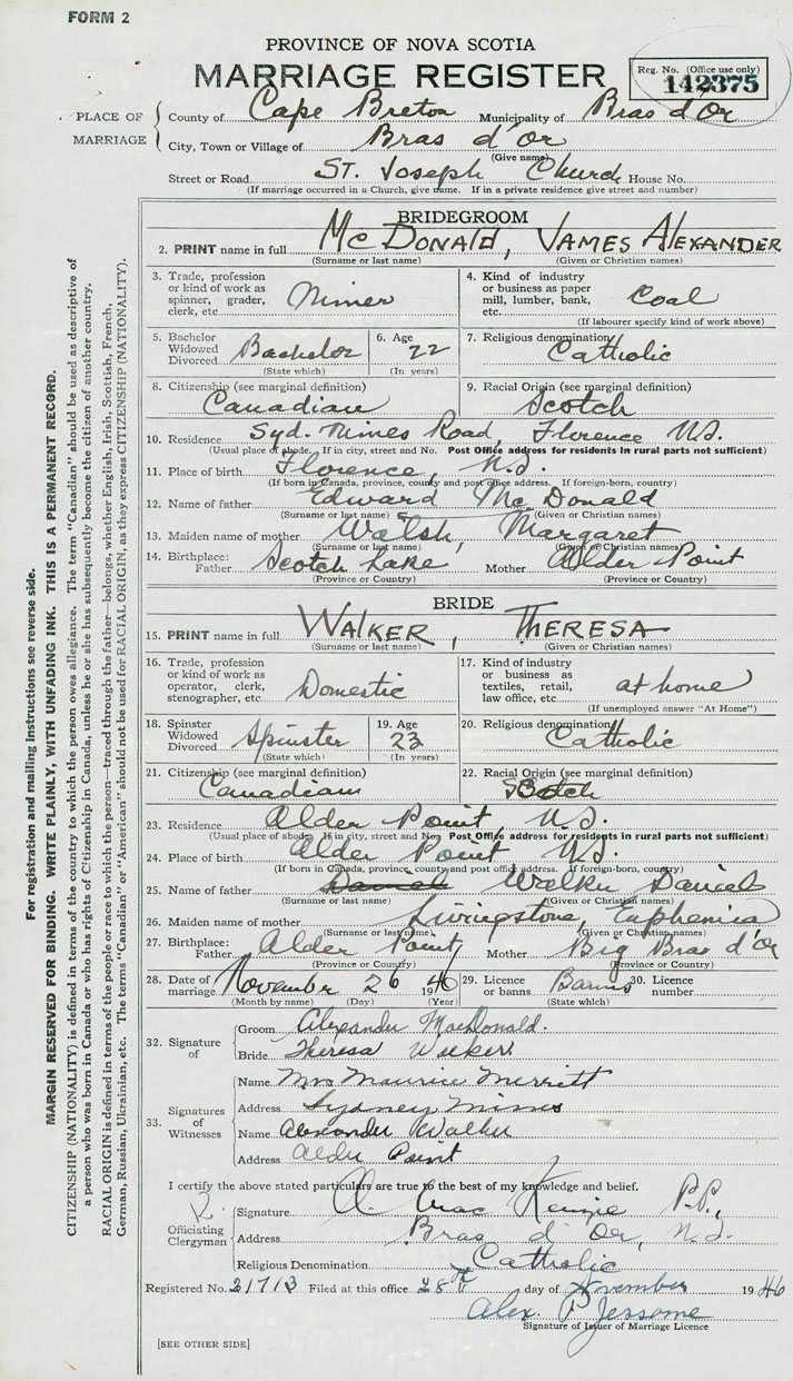 27. Birthplace Father Alder Point Mother Big Bras d'Or