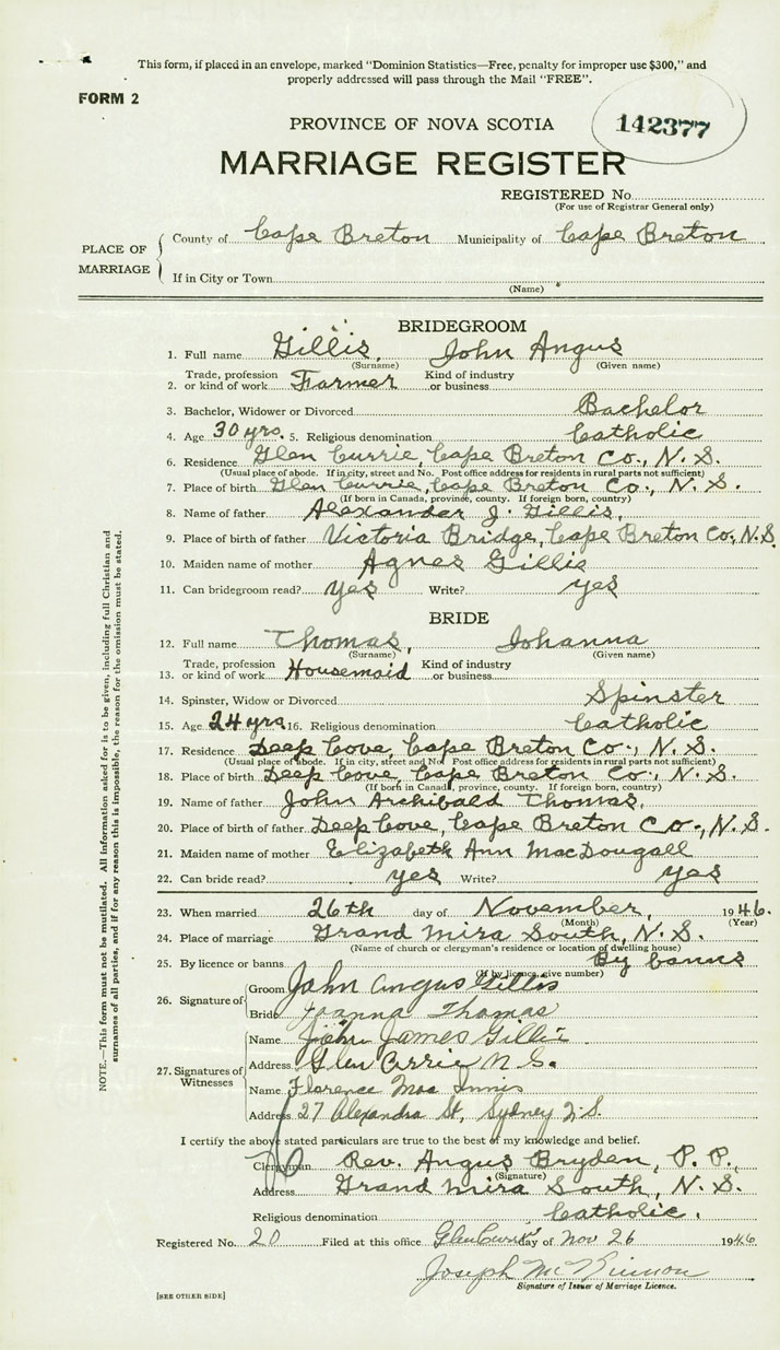 PLACE OF MARRIAGE County of Cape Breton in City or Town Grand Mira South