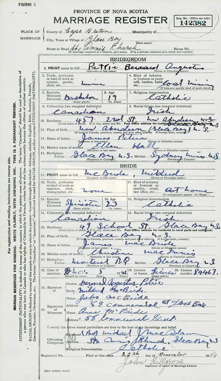 28. Date of marriage November 5 1946 29. By license or banns License 30. License number 84467