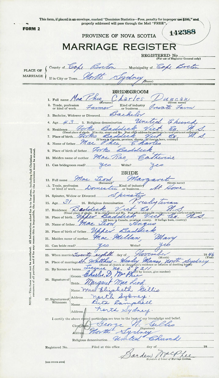 PLACE OF MARRIAGE County of Cape Breton in City or Town North Sydney