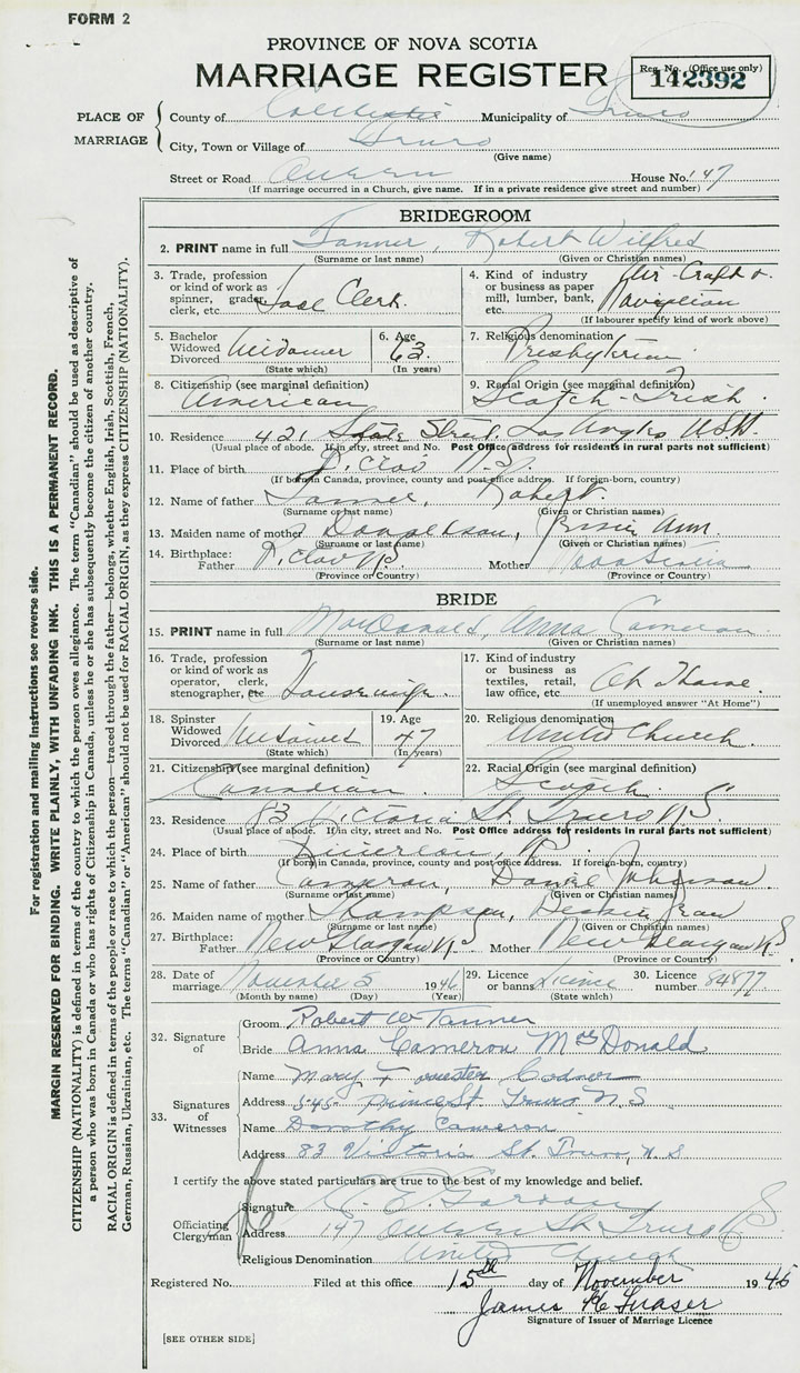 28. Date of marriage November 5 1946 29. By license or banns License 30. License number 84877