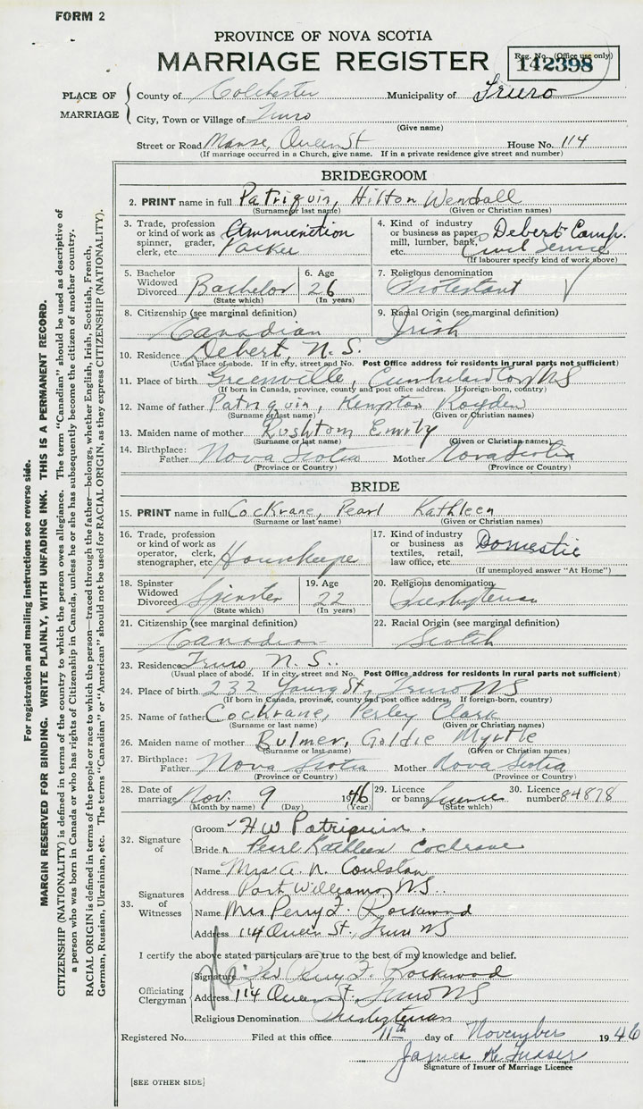 28. Date of marriage November 9 1946 29. By license or banns License 30. License number 84878