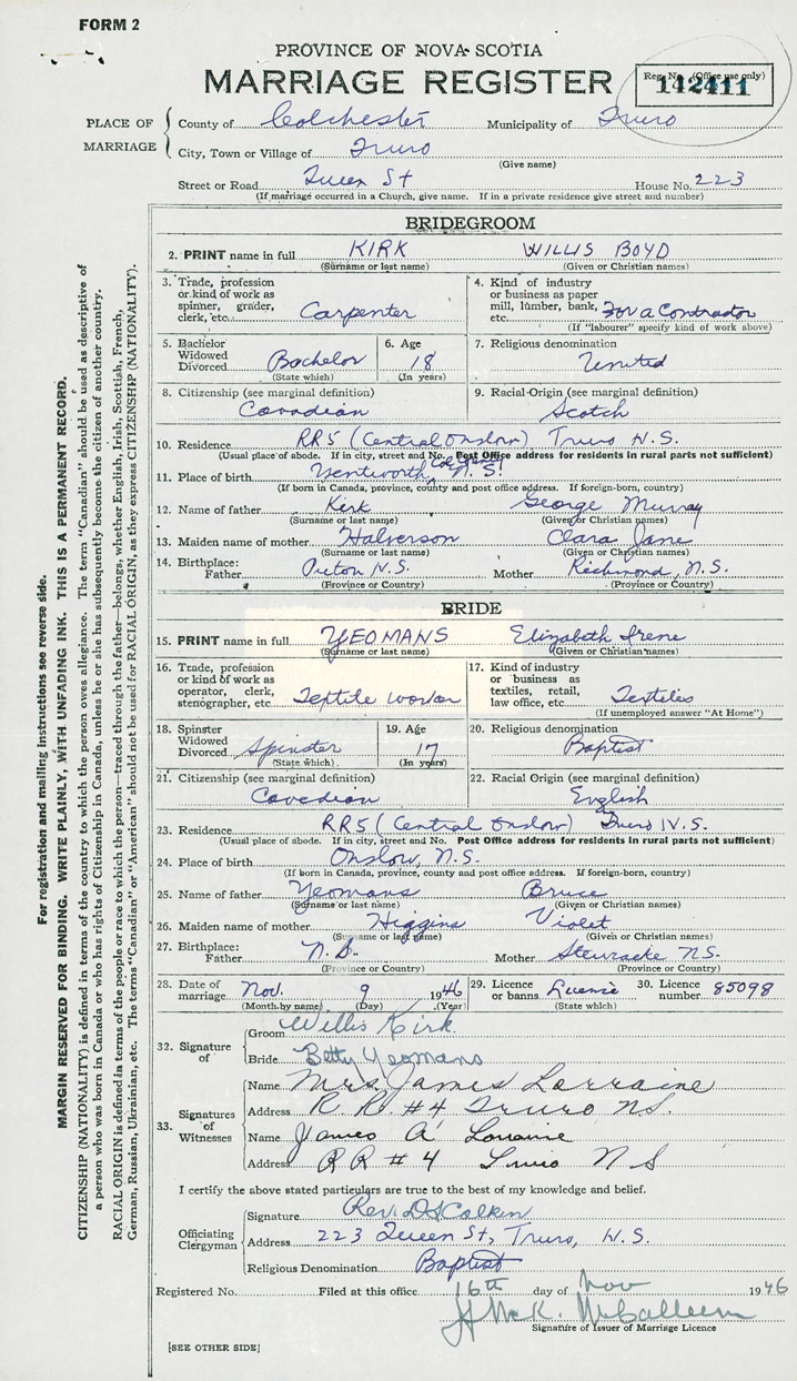 28. Date of marriage November 9 1946 29. By license or banns License 30. License number 85098