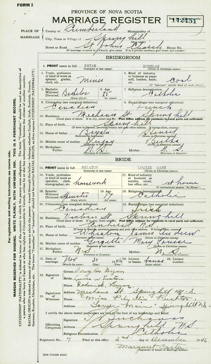 28. Date of marriage November 30 1946 29. By license or banns License 30. License number