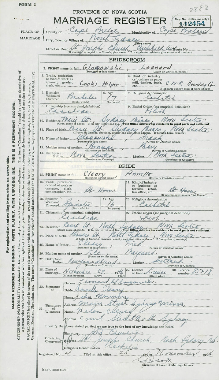 28. Date of marriage November 22 1946 29. By license or banns License 30. License number 85218