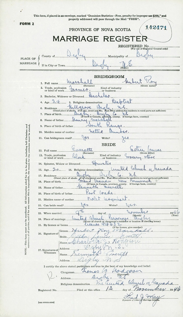 26. Place of marriage United Church Parsonage Digby, Digby County