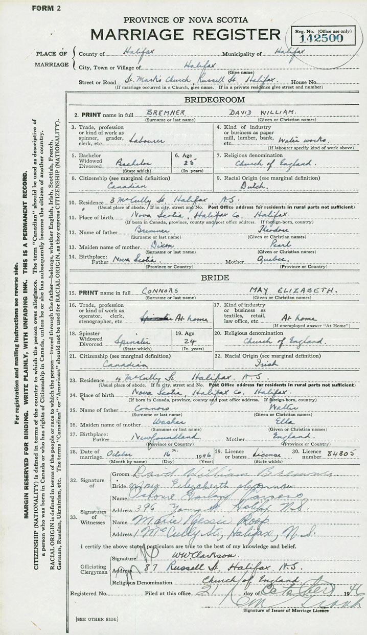 28. Date of marriage October 16 1946 29. By license or banns License 30. License number 84305