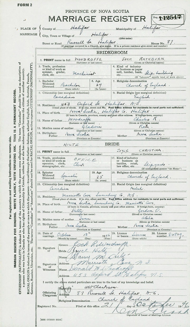 28. Date of marriage October 18 1946 29. By license or banns License 30. License number 84809