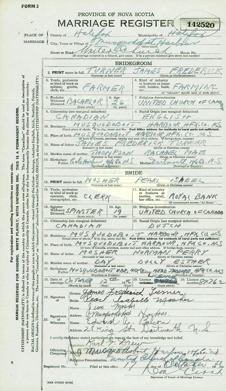 27. Birthplace Father Musquodoboit Harbour HFX Co Mother Head Jeddore, HFX Co