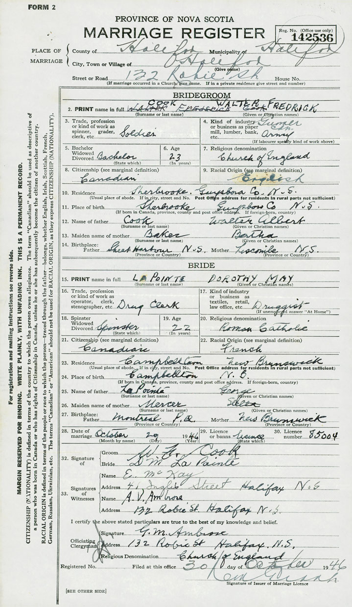 28. Date of marriage October 29 1946 29. By license or banns License 30. License number 85004