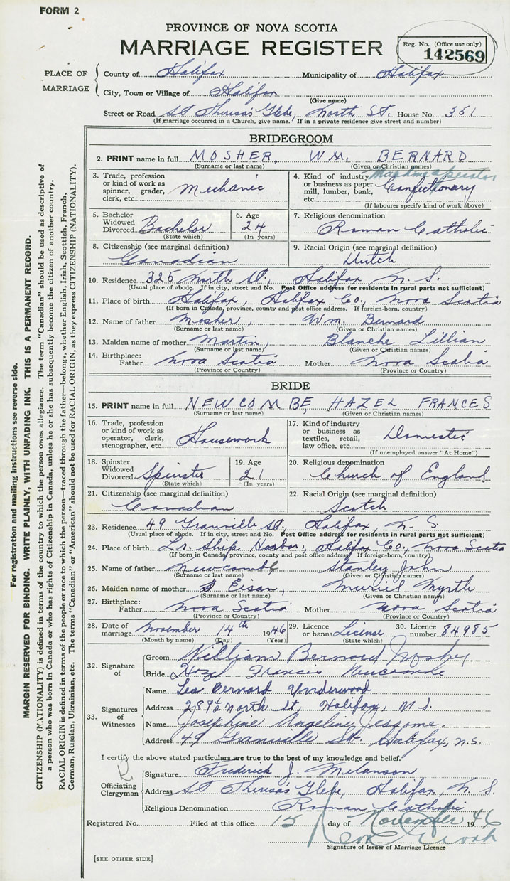 28. Date of marriage November 14 1946 29. By license or banns License 30. License number 84985