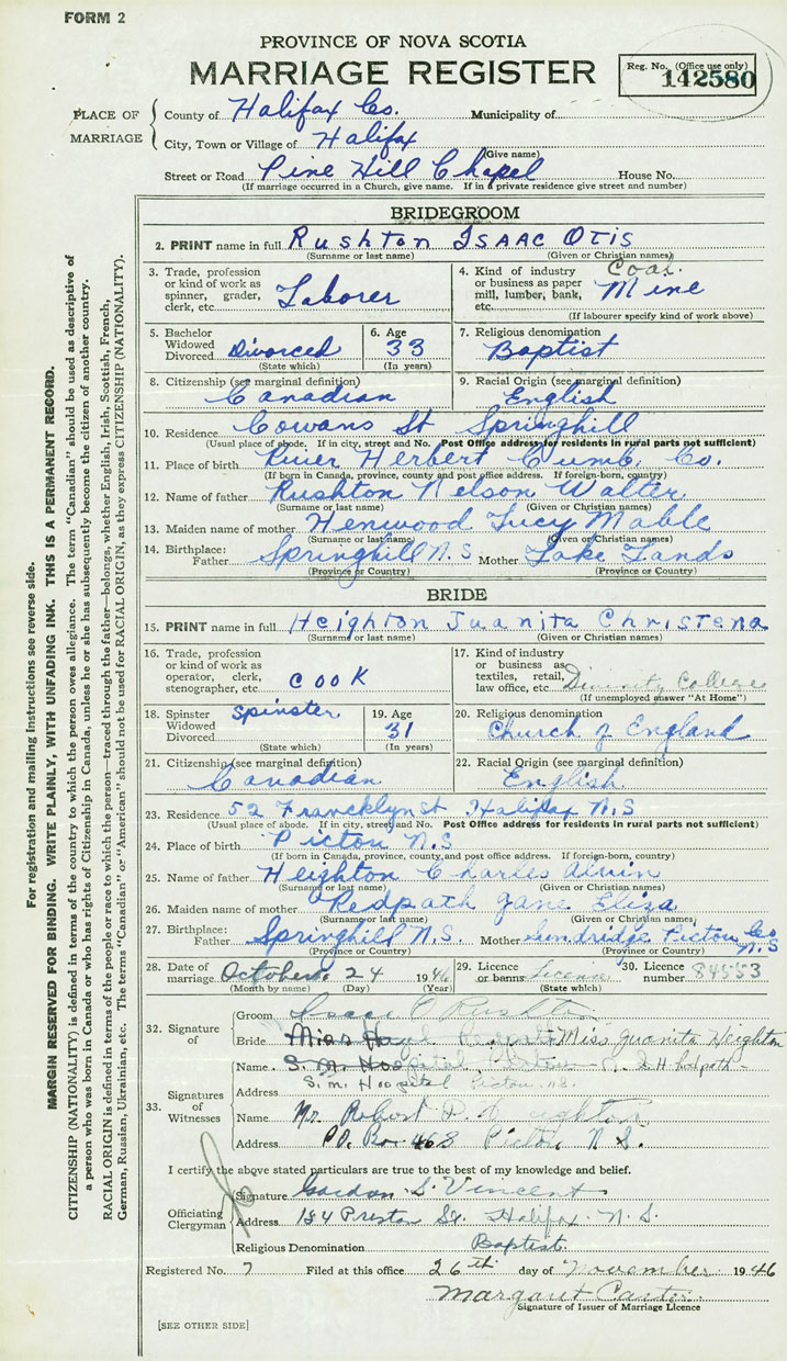 28. Date of marriage October 24 1946 29. By license or banns License 30. License number 84553