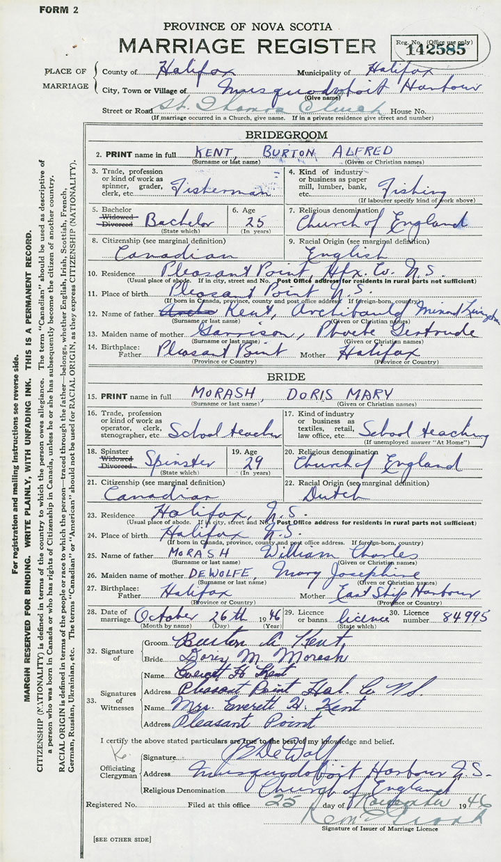 28. Date of marriage October 26 1946 29. By license or banns License 30. License number 84995