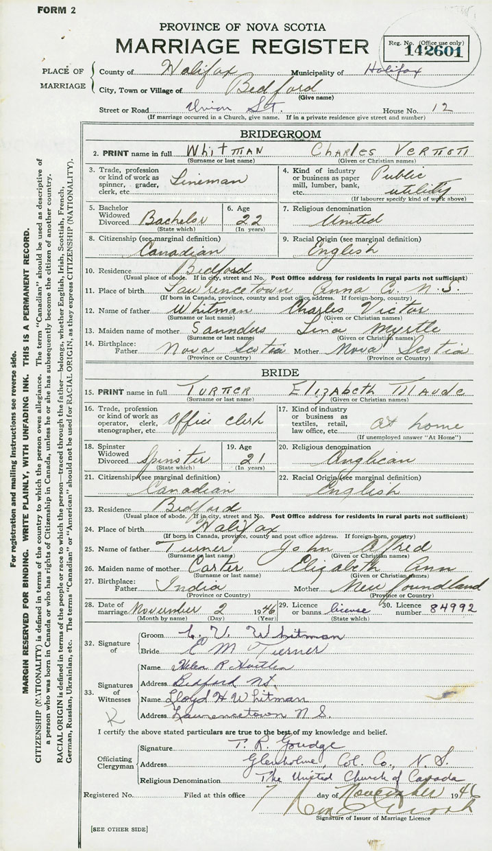 28. Date of marriage November 2 1946 29. By license or banns License 30. License number 84992