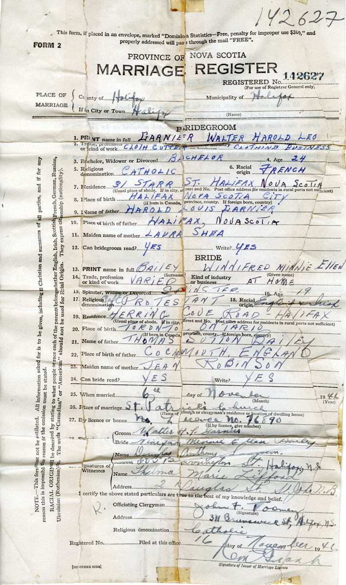 PLACE OF MARRIAGE County of Halifax in City or Town Halifax