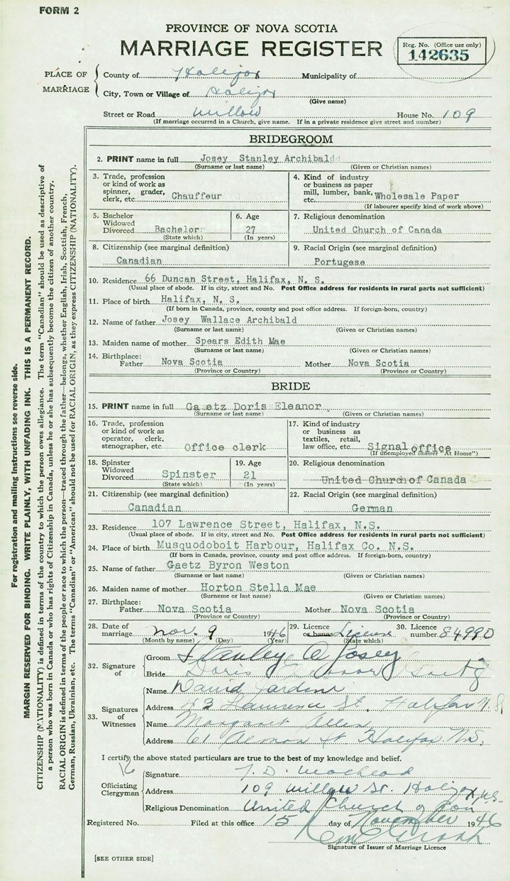 28. Date of marriage November 9 1946 29. By license or banns License 30. License number 84990